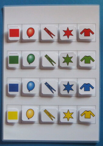 Eine Aufbewahrungstasche, vier Kategorienkarten (rot, gelb, grün, blau), je vier Karten Pullover, Stern, Wäscheklammer, Luftballon in den Farben rot, gelb, grün und blau (laminiert und mit Hakenband).