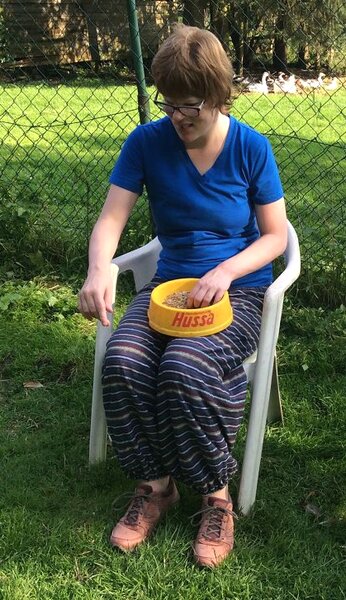 Seit März 2016 laufen wir nun alle zwei bis drei Tage zu Jochen und seinen Tieren. Annika hat im Laufe der Jahreszeiten die Lämmer aufwachsen sehen, hat immer wieder Schafe gestreichelt, ist mit Schafen spazieren gegangen, hat Hühner gefüttert und sich gefreut, wenn Jochen seine Hunde holte.